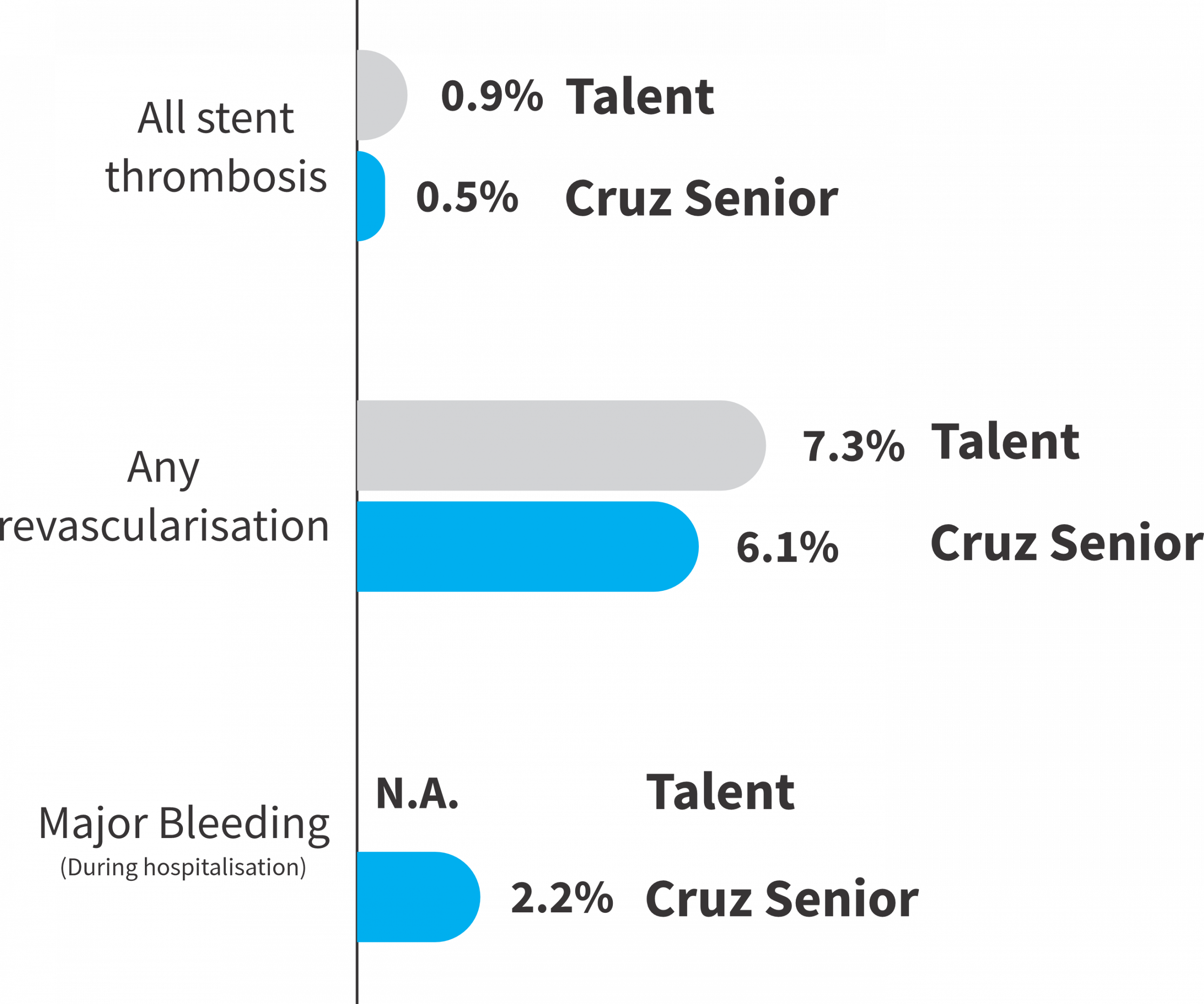 - Comparable event rates to previous lower-risk SES PCI cohorts, confirming the strong safety profile of Supraflex Cruz platform in a challenging aged PCI-all-comer population.